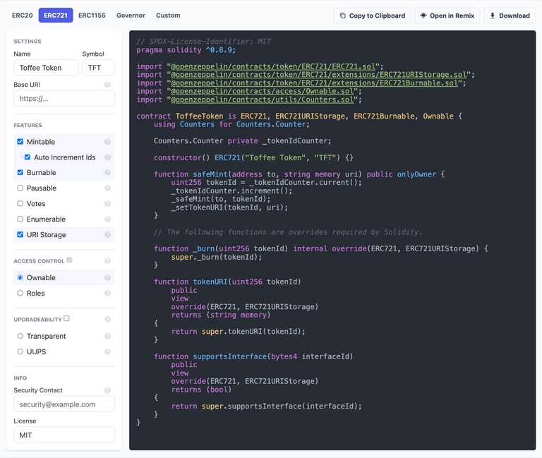 With the resulting lines of code, you now have the NFT token contract written in Solidity. As mentioned above, this source code can now be ported to an IDE of your choice or opened directly in Remix.